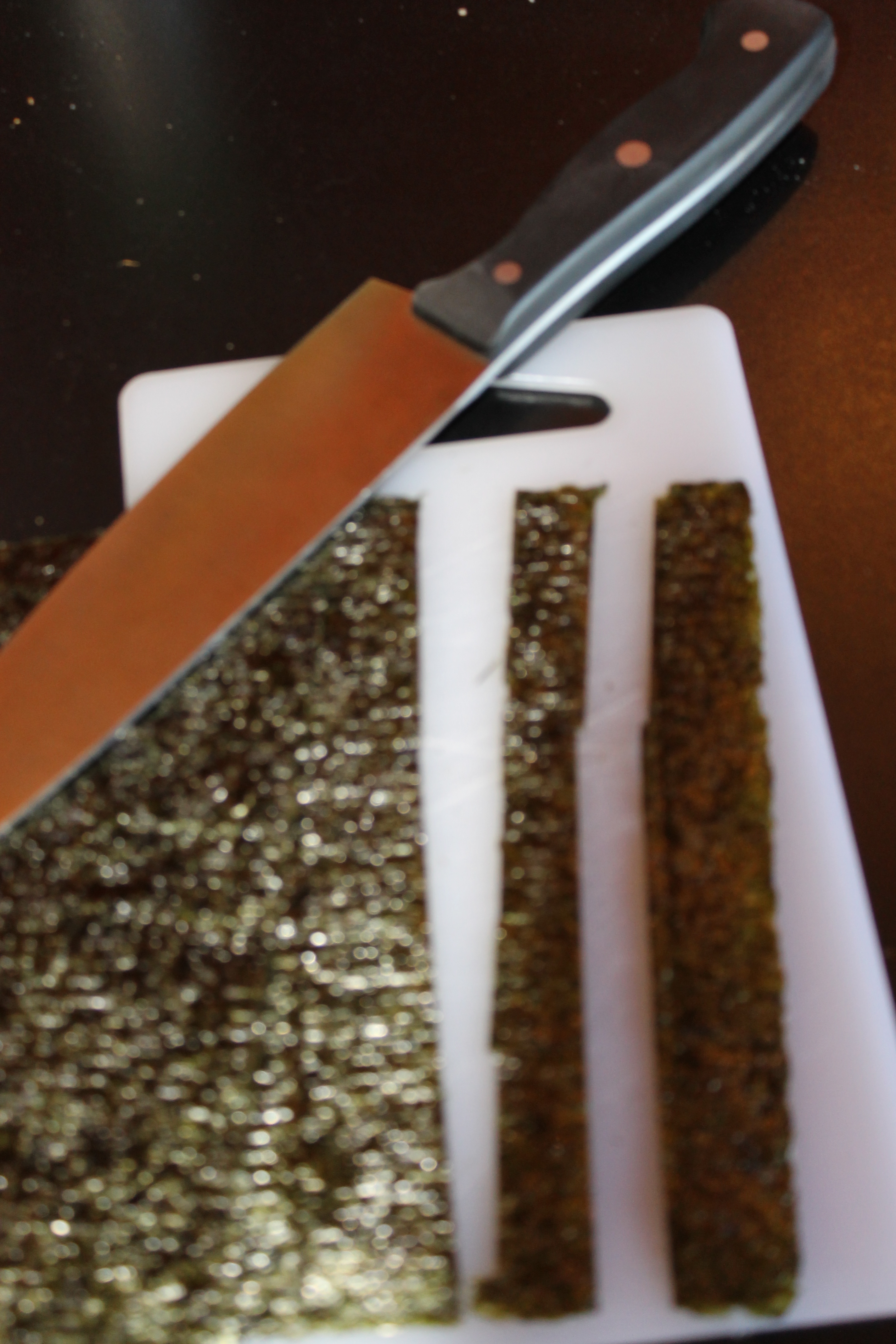 While the rice is cooling, cut up your dried seaweed by pressing a sharp knife into the sheet (see photo — yah, okay, the strips aren’t even. I’m not Japanese. I’m Irish — we don’t know how to make straight lines). Put strips aside.