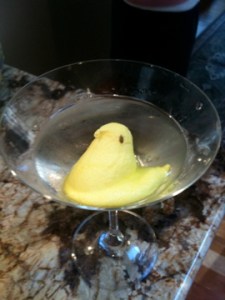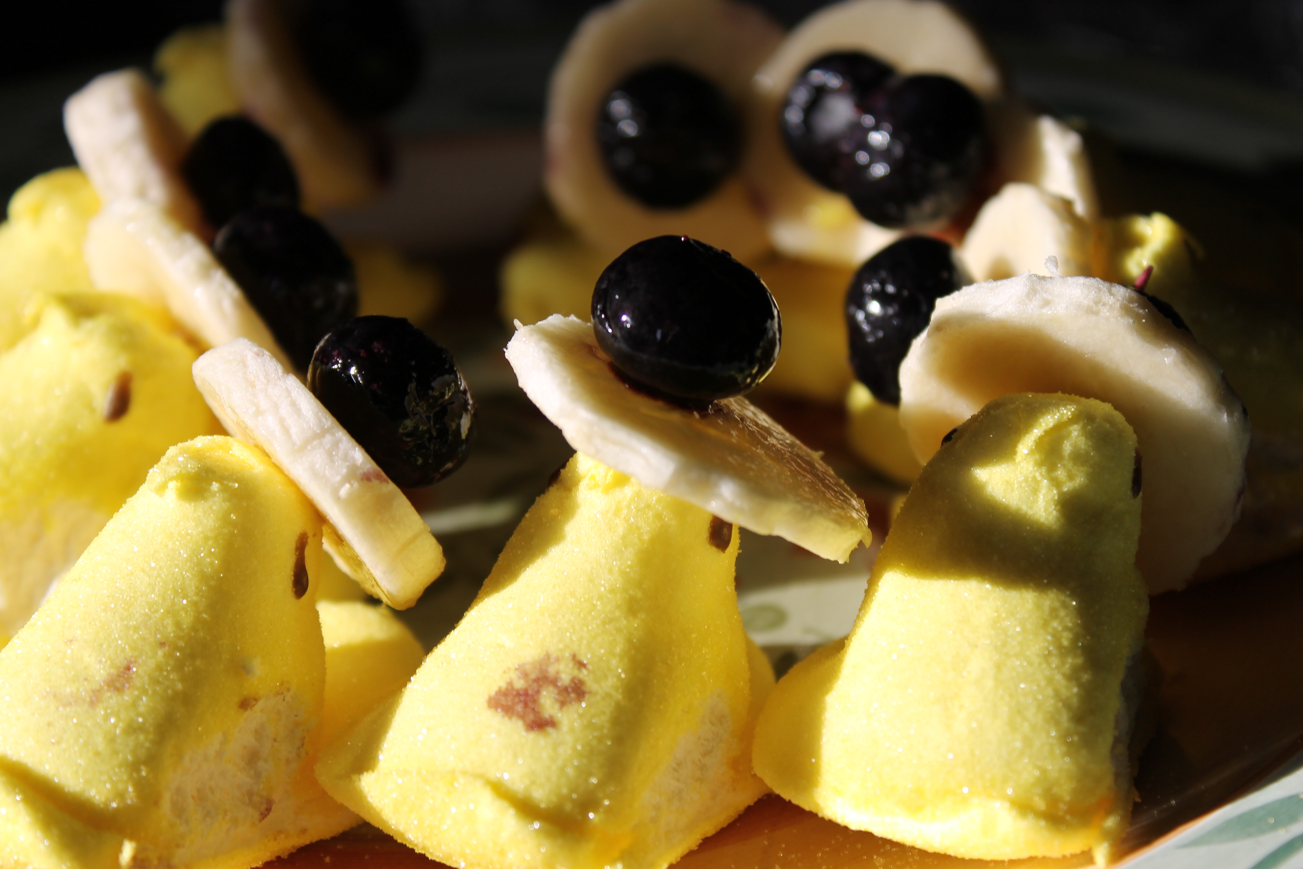 Now you know my devotion to my Peeps® knows no bounds. I love them like no one has loved a marshmallow bird before, but some of the recipes in which I toss them aren’t all that great. It pains me to say this and please don’t repeat it to the peeps, but it’s true. Take Peepshi — a tsunami of flavor for example. I wasn’t being cute, it’s true. It’s total devastation in your mouth. Now, sometimes the salty and sweet work really well together like (weirdly enough) Sooz’s Weenie Peeps which are actually kinda good but with the Peepshi — not so much. The combination of the seaweed and the sugar is horrid — best used for decoration. So imagine my delight when I threw together Peeps Stone-Cold, Mighty-Tasty Fruit Salad. Some kind of yum, lemme tell ya.