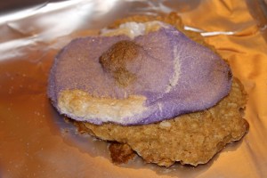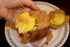 The Peeps® and I were sitting around talking about the blog and they pointed out that breakfast is sorely underrepresented here. Other than Croissants du Peep, there really isn’t a good, hearty breakfast choice. So we came up with Peeps Benedict, a peepier version of the usual artery-blocking favorite. The peeps love hollandaise sauce just like everyone else on the planet. (How can you go wrong with butter, milk, and lemon — other than curdling which of course is going way wrong.) It was all I could do to keep them out of the sauce. Actually this is a problem with any recipe; the peeps love hitting the sauce. They gobble it down, bathe in it, throw it around the kitchen — one time they completely doused themselves with the stuff, after taking a few long pulls on the bottle of course, and jumped on the dog and rode him like a bronco all around the kitchen. Goodness gracious what a mess that was. It totally freaked out the poor canine of course and he’s never been able to look at the peeps without fear in his eyes since. In fact, I now keep him in another part of the house when I’m cooking with peeps. It’s just too traumatic for the poor animal.